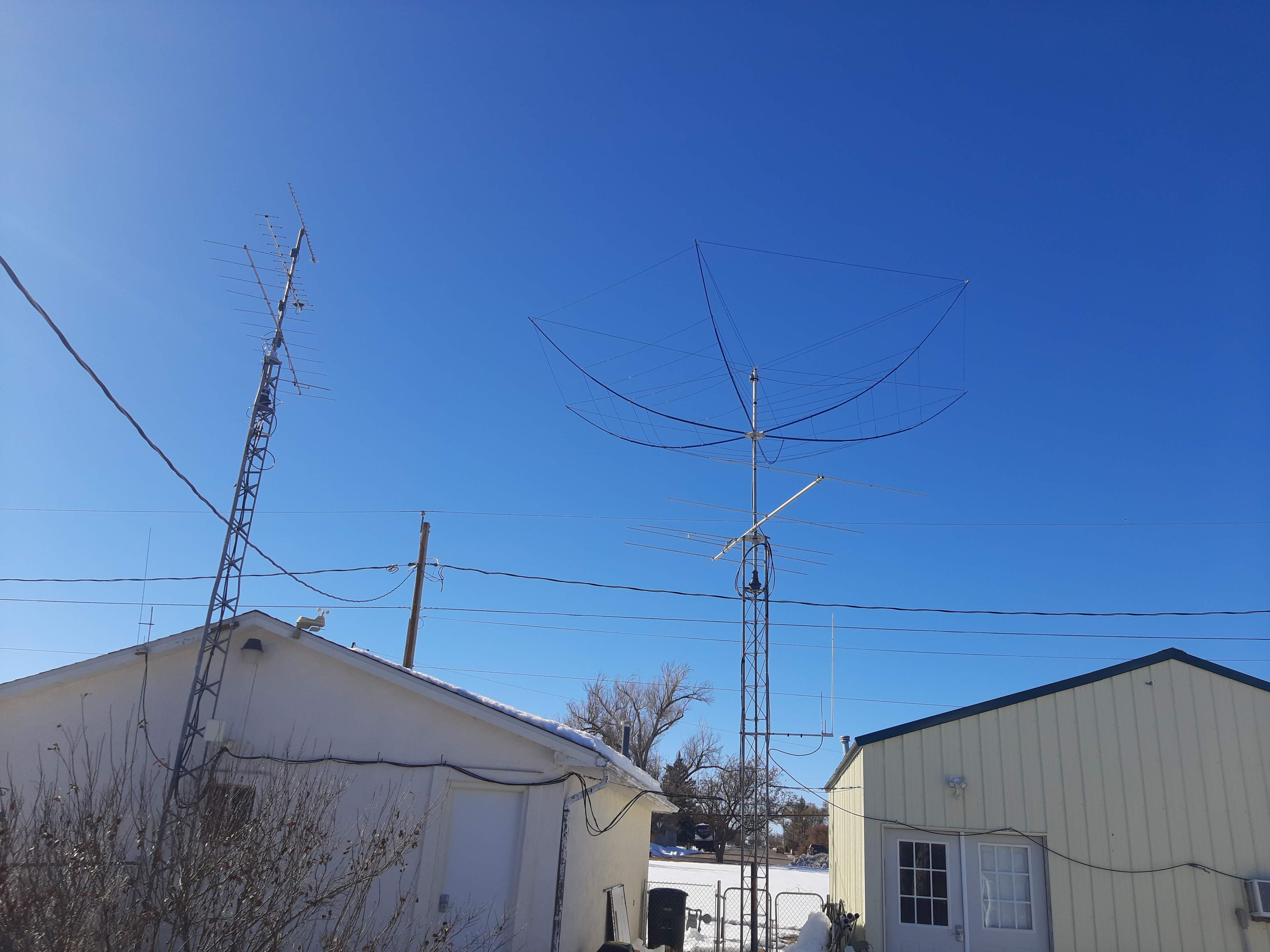 Here is the current antenna farm. 2m, 70cm and 23 cm antennas all horizontal on tower 1. Hexbeam (20-6m), and 6m beam on tower 2. A couple of dual band j-poles for local repeaters.