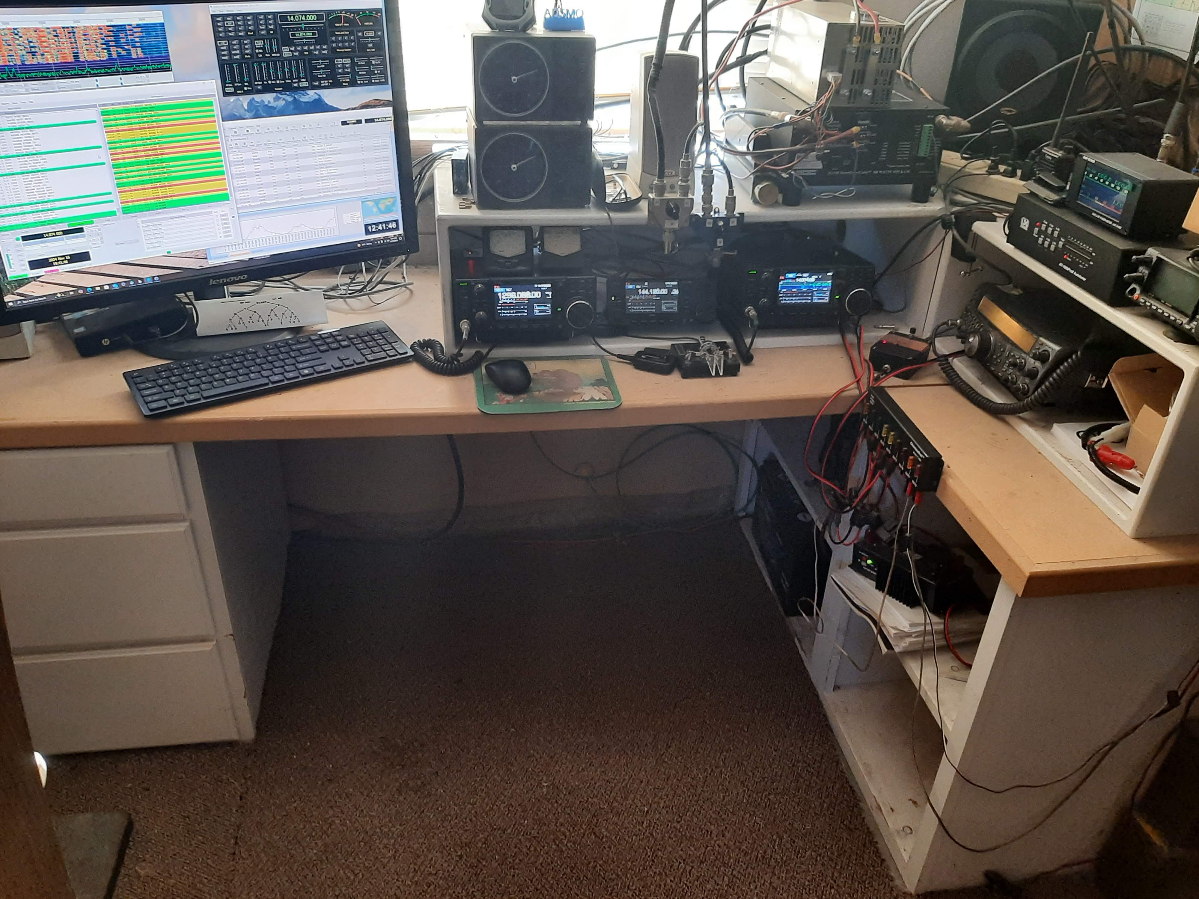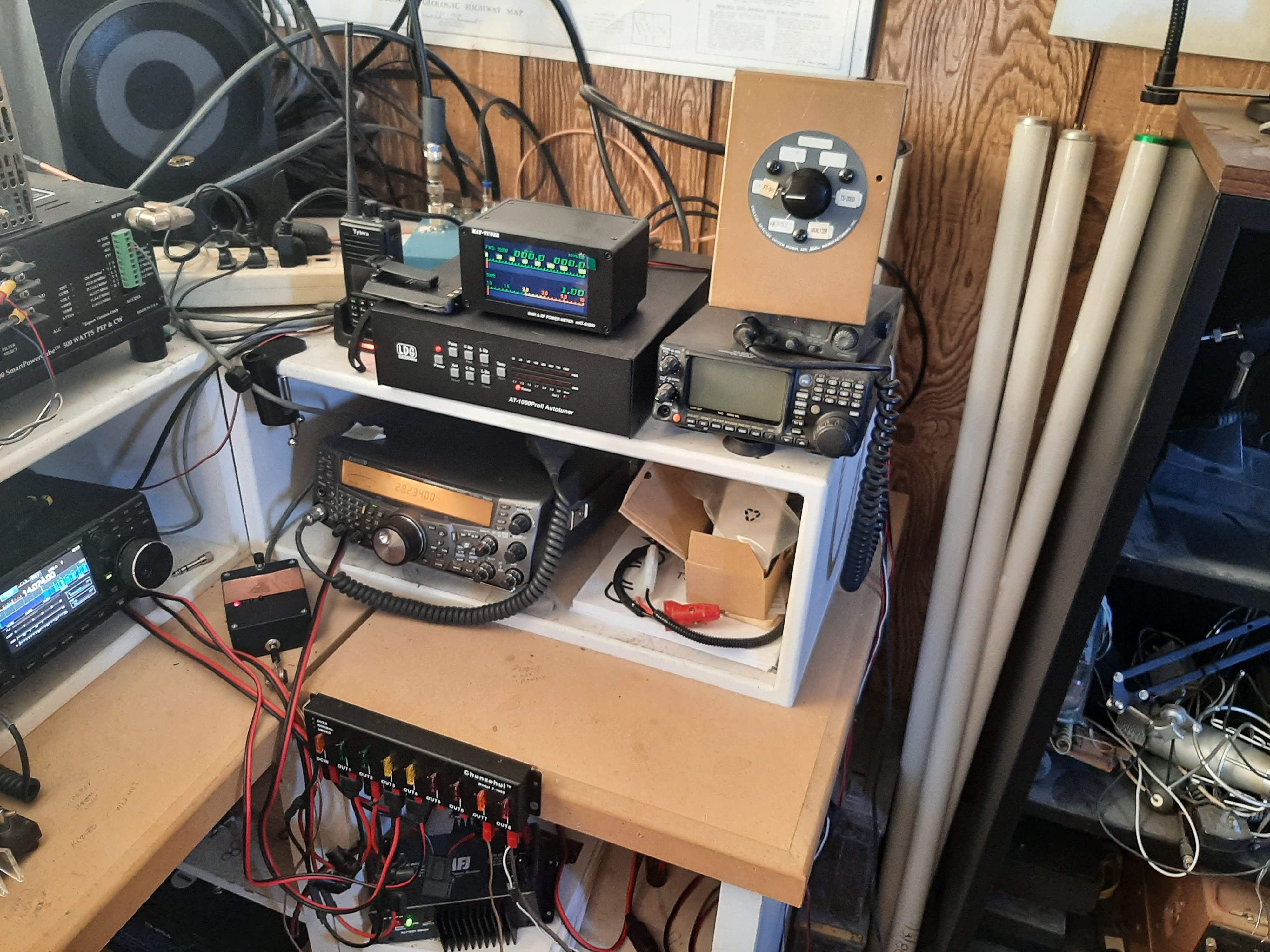 Here is the radio room, separately enclosed within the garage with lots of storage. Radios in the center are IC-9700, IC-905, IC-7300